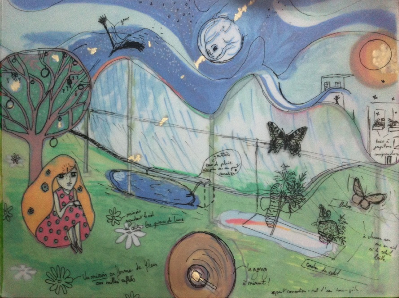 devient en paysage : la nuit : traitement de la nuit : les étoiles un télescope, des miroirs au sol refletant la lune, des petites choses phosphorescentes accrochées dans les arbre